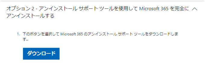 ①サイト下にある「オプション2-アンインストールツールを使用してMicrosoft365を完全にアンインストールする」を選択します