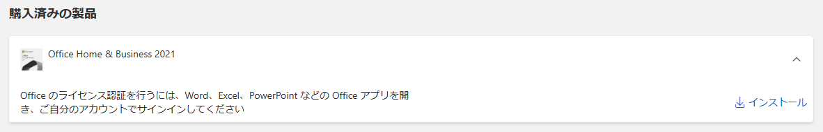 購入済みの製品からインストールするOffice製品の「インストール」を選択する