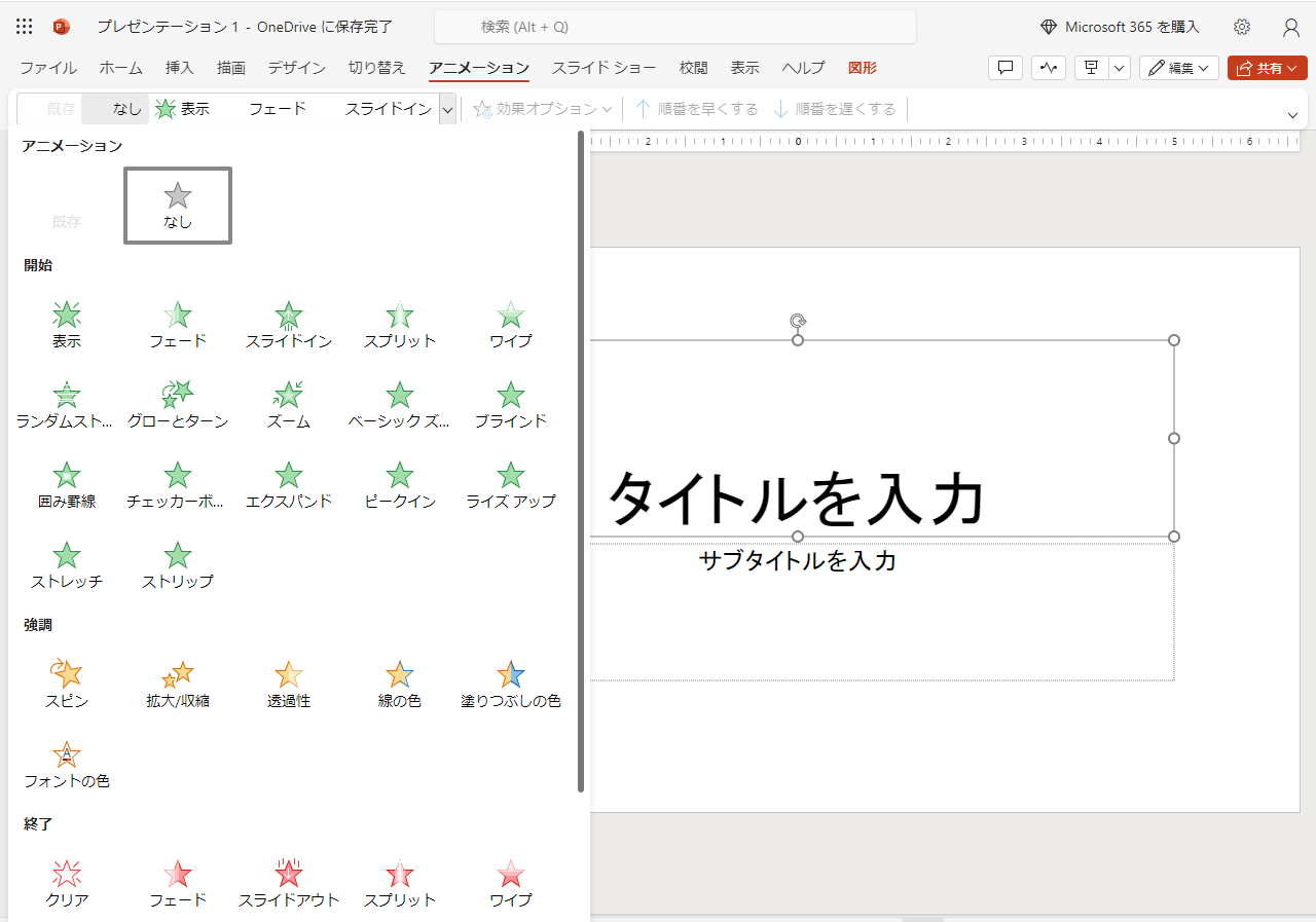 基本的なアニメーションだけでも十分ですが、デスクトップ版にある「その他の開始効果」や「その他の強調効果」といった少し凝った動作は指定できません。